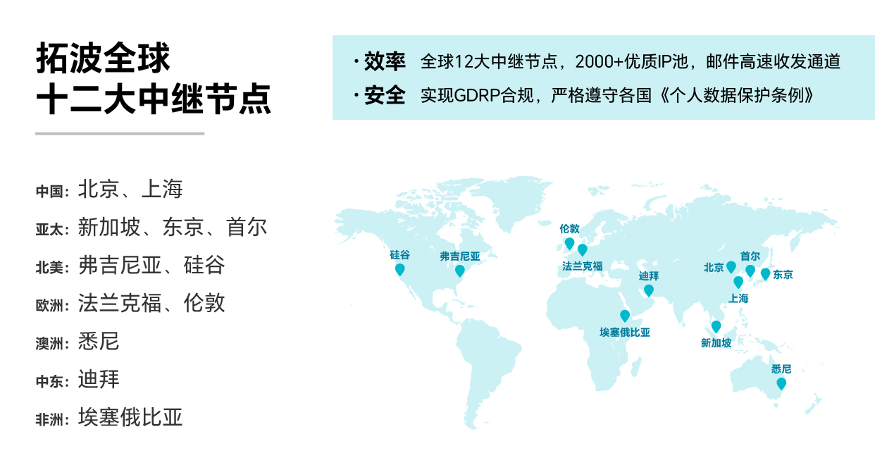 拓波通过部署于北美、欧洲、亚太等地的12大智能中继节点,维护2000+优质IP池,通过智能路由选择最优节点,显著提升海外邮件收发成功率,解决因GFW检查、IP黑名单(RBL)或跨境链路不稳定导致的延迟、退信。实现历史投递成功率99.97%,投递时延控制在300S内。