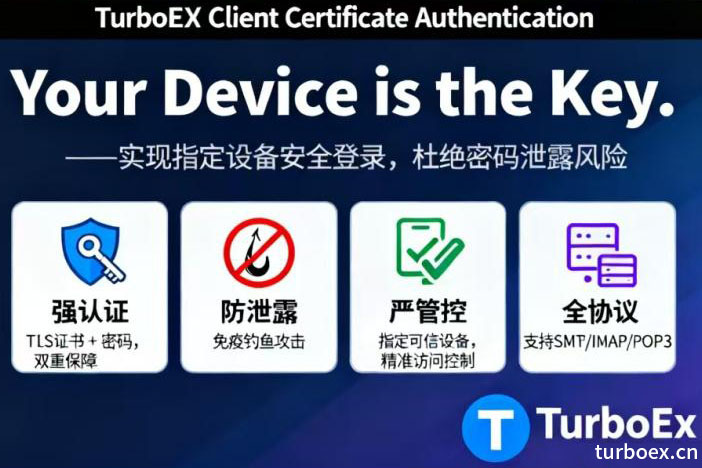 TurboEx邮件系统新增关键的安全增强功能——客户端证书认证。本功能通过支持各类邮件客户端使用TLS证书认证访客身份、限定可安装证书的指定认证设备双重功能,彻底杜绝了黑客最常用的从Outlook这类邮件客户端作为攻击入口的安全隐患。