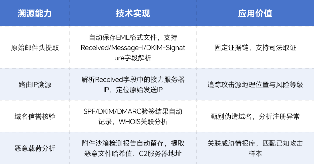 技术原理:基于对邮件头Received、Message-ID、DKIM-Signature等字段的深度解析,结合IP信誉库与域名注册信息分析,精准识别伪造邮件与恶意载荷。