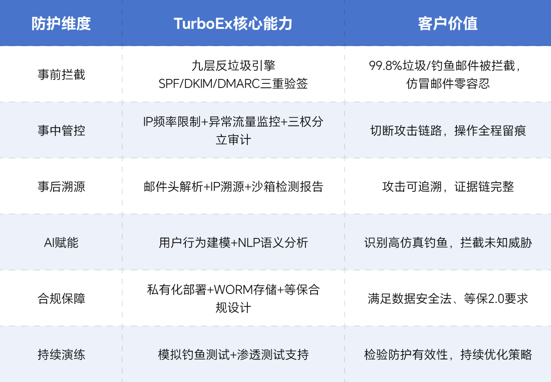 邮件安全绝非小事。TurboEx超融合邮件系统以三层联动防护体系为核心,结合专业邮件渗透与攻防演练服务、AI智能检测与全流程溯源能力,为企业构筑起从边界到核心的纵深防御,让邮件攻击无处遁形。